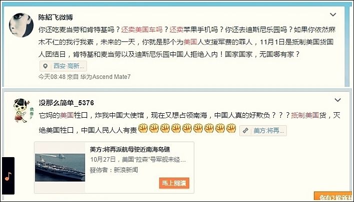 新浪微博戶「陳紹飛微博」發帖稱,「你還吃麥當勞和肯德基嗎?還賣美國車嗎?還賣蘋果手機嗎?你還去迪斯尼(迪士尼)樂園嗎?如果你依然麻木不仁的我行我素,未來的一天,你就是那個為美國人支援軍費的罪人,11月1日是抵制美國貨國人團結日,肯德基和麥當勞以及迪斯尼樂園中國人拒絕入內!國家國家,無國哪有家? 」
